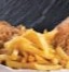 arroz, papas fritas y una presa de pollo, todo en una sola bandeja. una porcion perfecta para una persona con buen apetito
